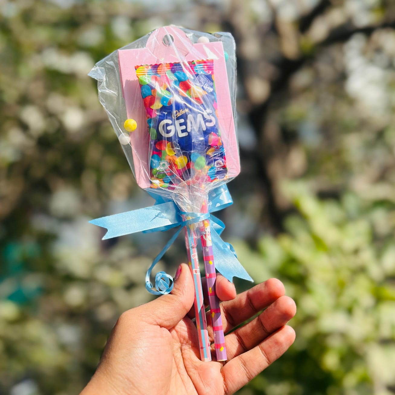 Includes: • 2 hb pencils • pair of hair bands • eraser • gems chocolate • Beautifully packed